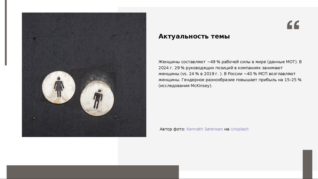Актуальность темыЖенщины составляют ~49 % рабочей силы в мире (данные МОТ). В