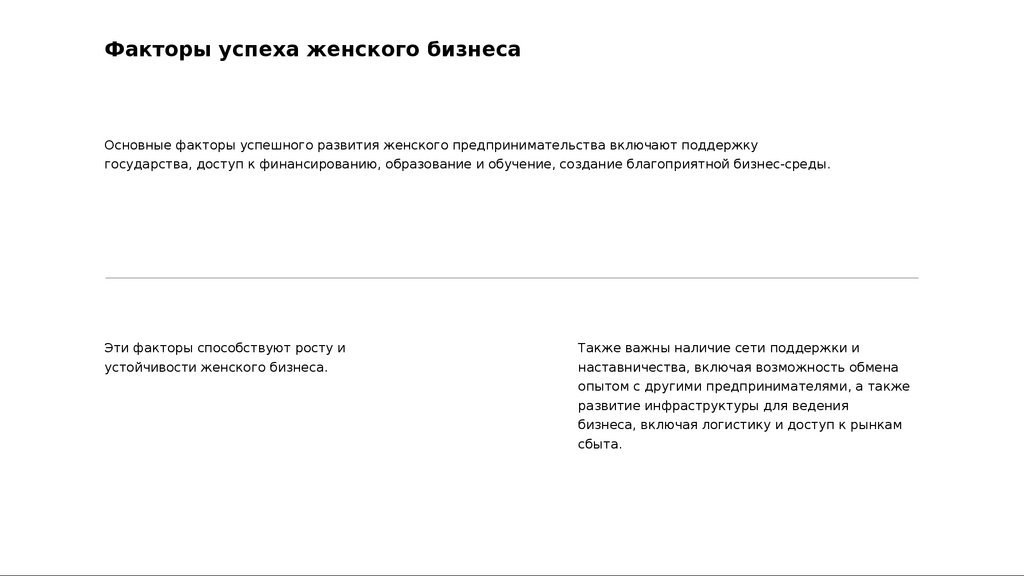 Факторы успеха женского бизнесаОсновные факторы успешного развития женского предпринимательства включают поддержку