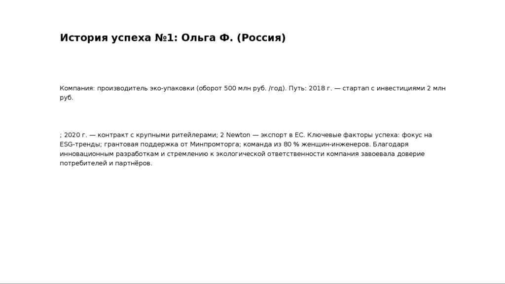 История успеха №1: Ольга Ф. (Россия)Компания: производитель эко‑упаковки (оборот 500 млн руб. /год). Путь: 2018 г. — стартап с инвестициями 2 млн