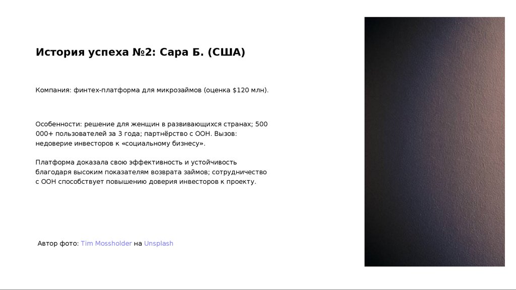 История успеха №2: Сара Б. (США)Компания: финтех‑платформа для микрозаймов (оценка $120 млн).