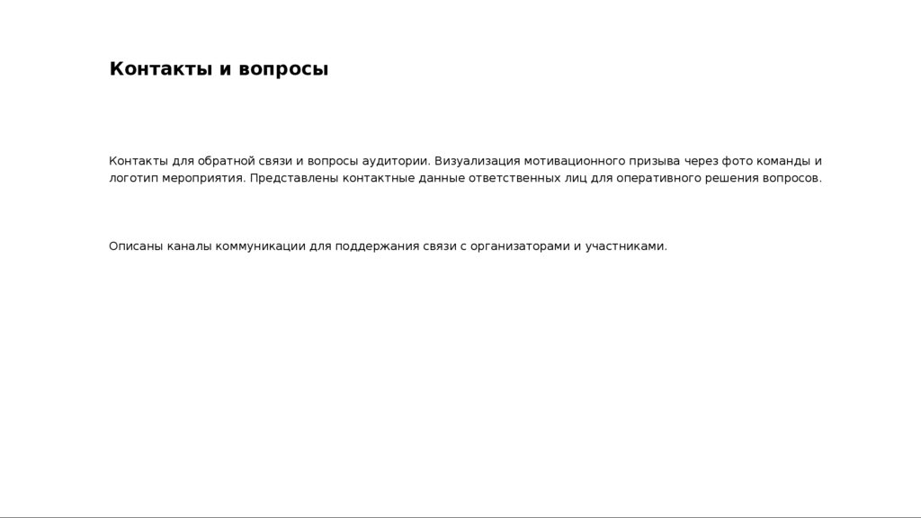 Контакты и вопросыКонтакты для обратной связи и вопросы аудитории. Визуализация мотивационного призыва через фото команды и