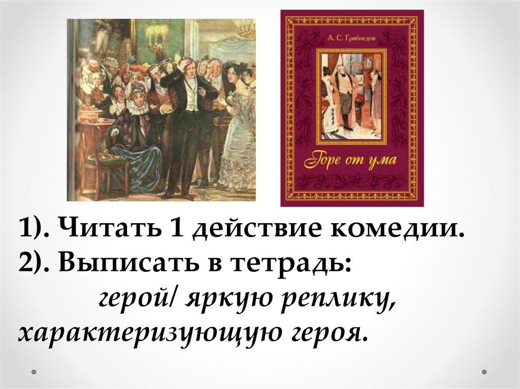 1). Читать 1 действие комедии.2). Выписать в тетрадь: