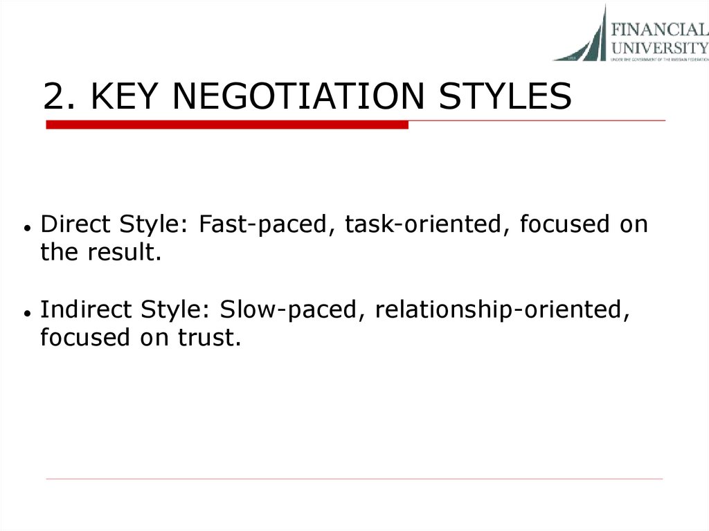 2. KEY NEGOTIATION STYLESDirect Style: Fast-paced, task-oriented, focused on