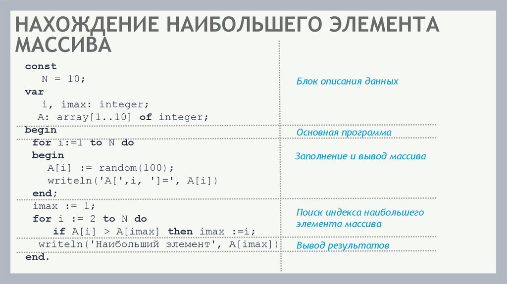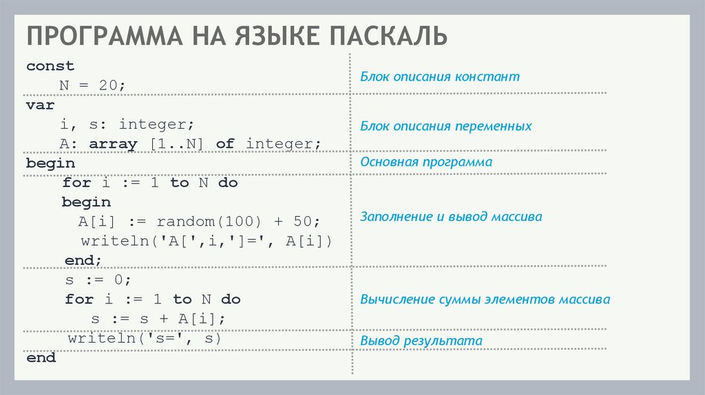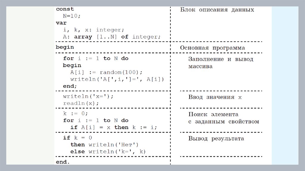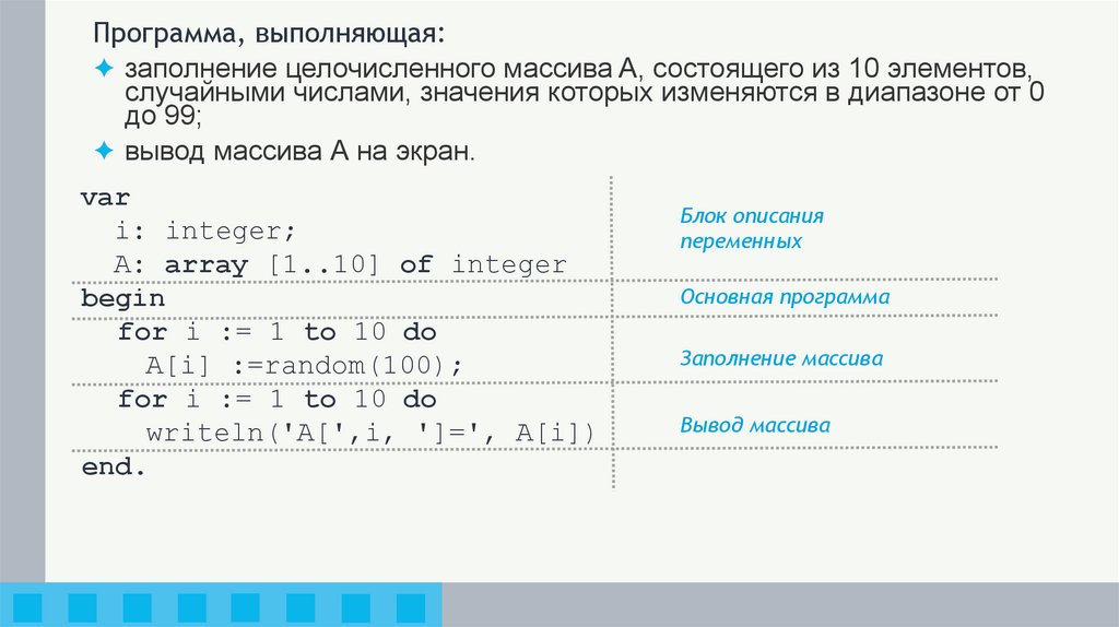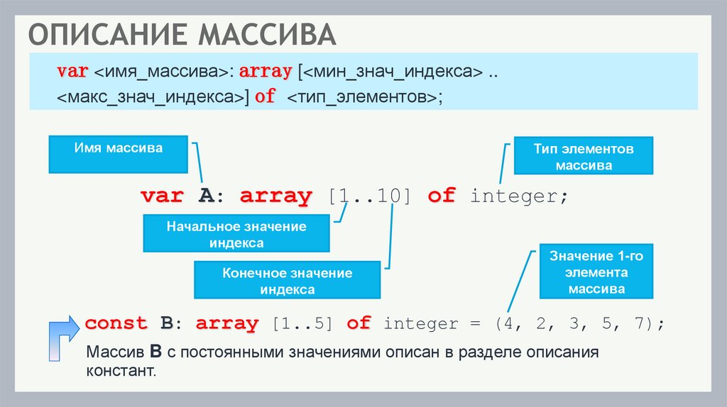 ОПИСАНИЕ МАССИВАvar <имя_массива>: array [<мин_знач_индекса> ..