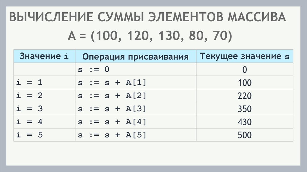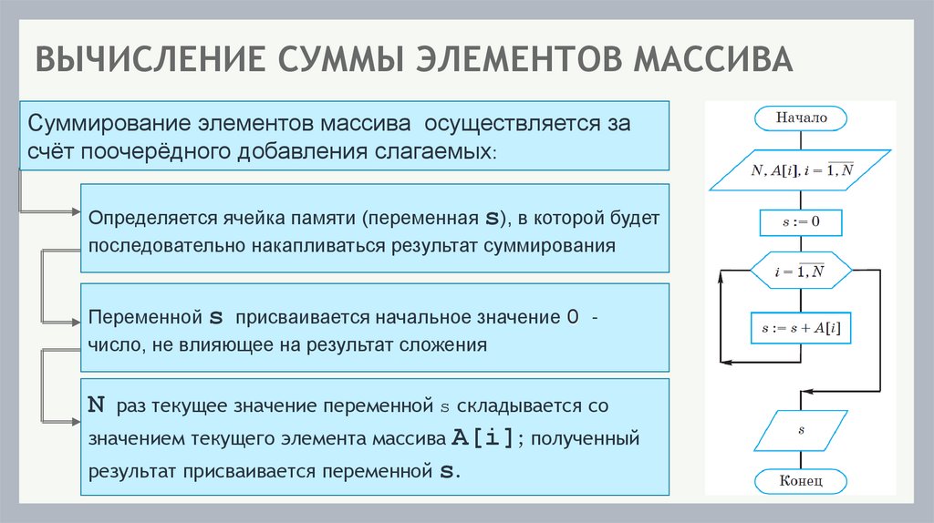 ВЫЧИСЛЕНИЕ СУММЫ ЭЛЕМЕНТОВ МАССИВАСуммирование элементов массива осуществляется за