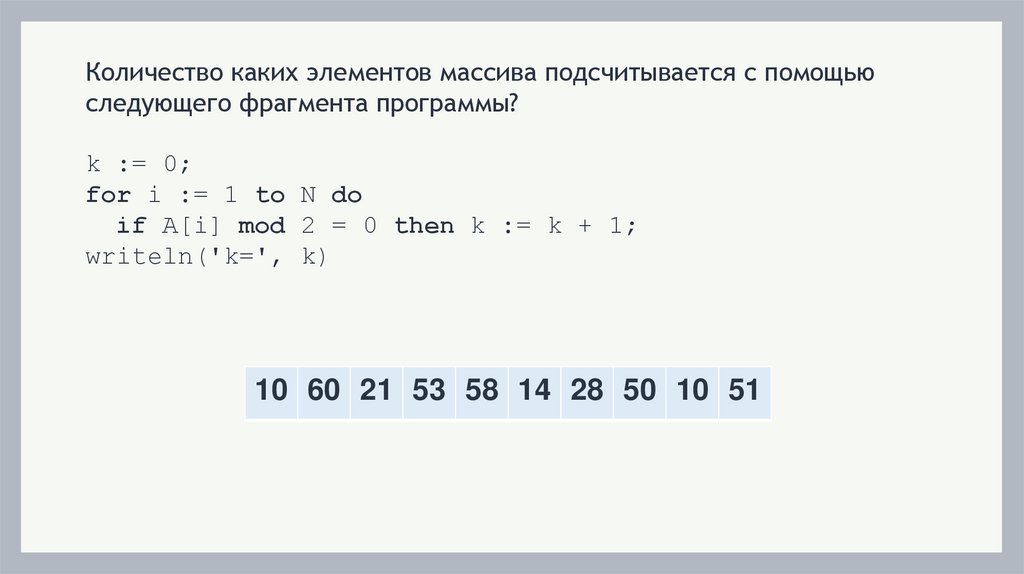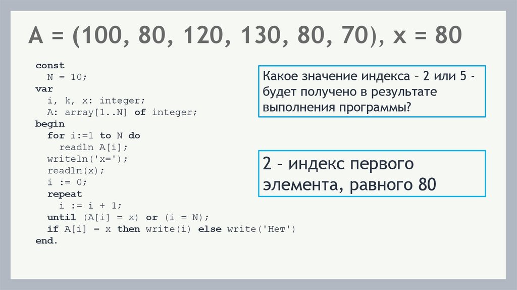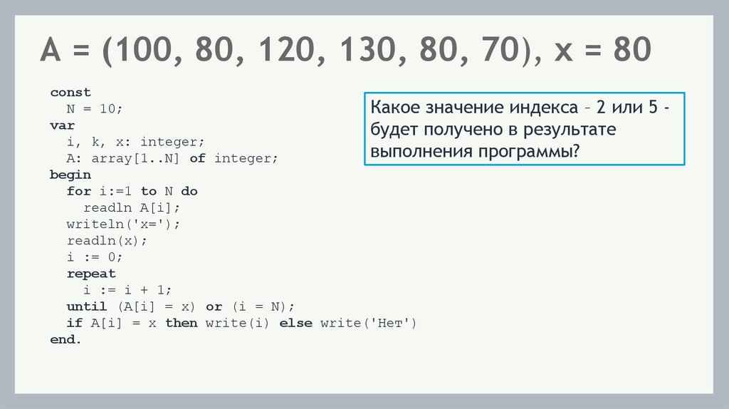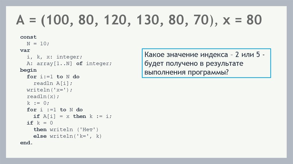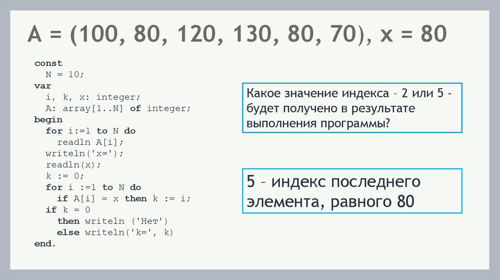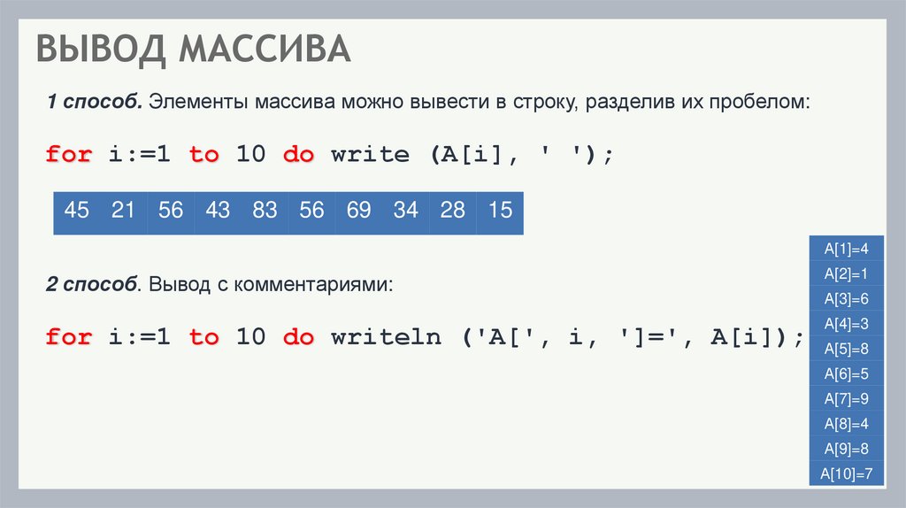 for i:=1 to 10 do writeln ('A[', i, ']=', A[i]); А[5]=8