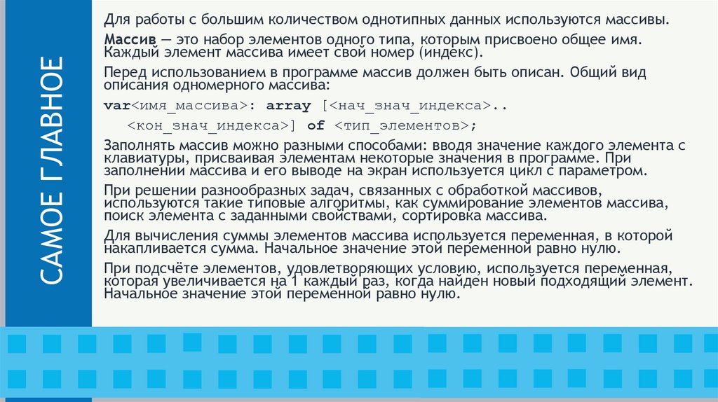 САМОЕ ГЛАВНОЕДля работы с большим количеством однотипных данных используются массивы.