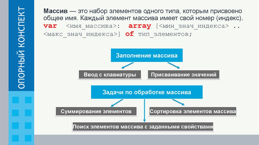 ОПОРНЫЙ КОНСПЕКТМассив — это набор элементов одного типа, которым присвоено