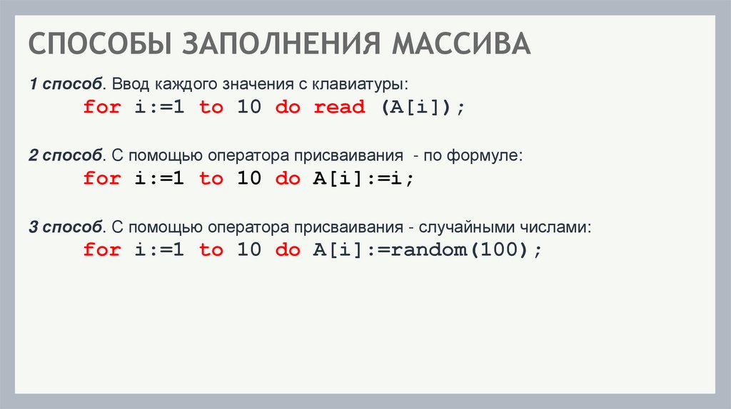 СПОСОБЫ ЗАПОЛНЕНИЯ МАССИВА1 способ. Ввод каждого значения с клавиатуры: