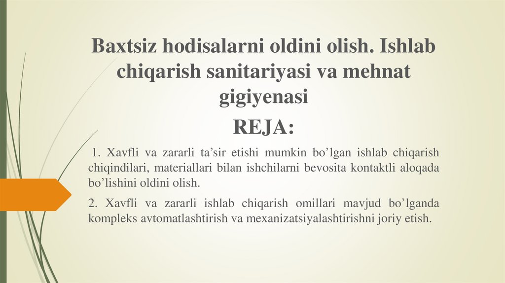 Baxtsiz hodisalarni oldini olish. Ishlabchiqarish sanitariyasi va mehnat