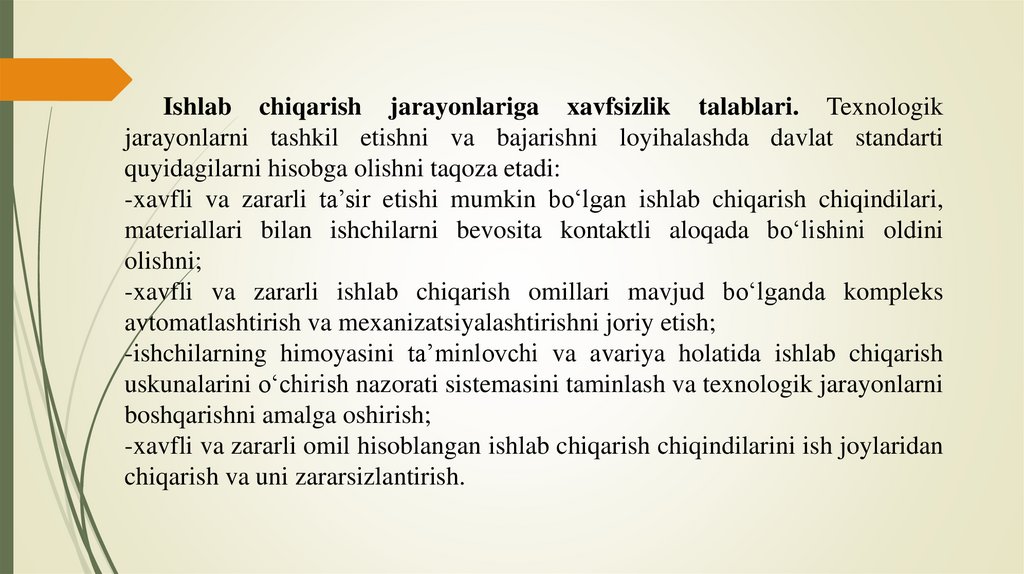 Ishlab chiqarish jarayonlariga xavfsizlik talablari. Texnologikjarayonlarni tashkil etishni va bajarishni loyihalashda davlat standarti