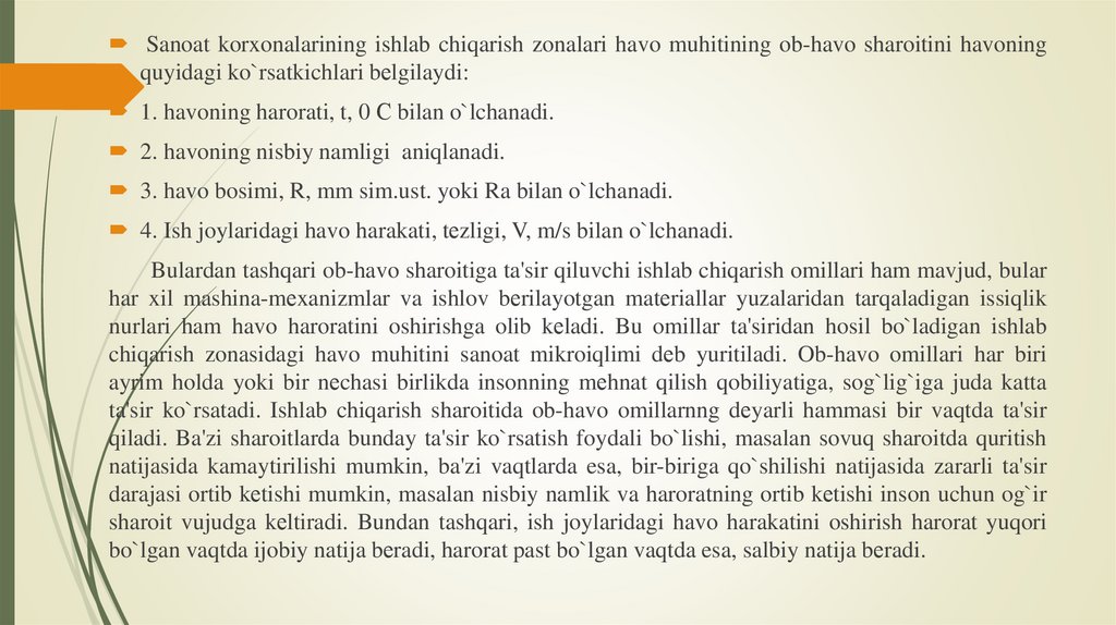Sanoat korxonalarining ishlab chiqarish zonalari havo muhitining ob-havo sharoitini havoningquyidagi ko`rsatkichlari bеlgilaydi: