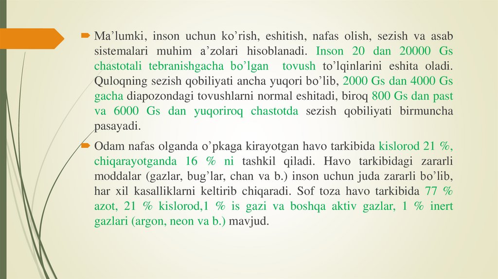 Ma’lumki, inson uchun ko’rish, eshitish, nafas olish, sezish va asabsistemalari muhim a’zolari hisoblanadi. Inson 20 dan 20000 Gs