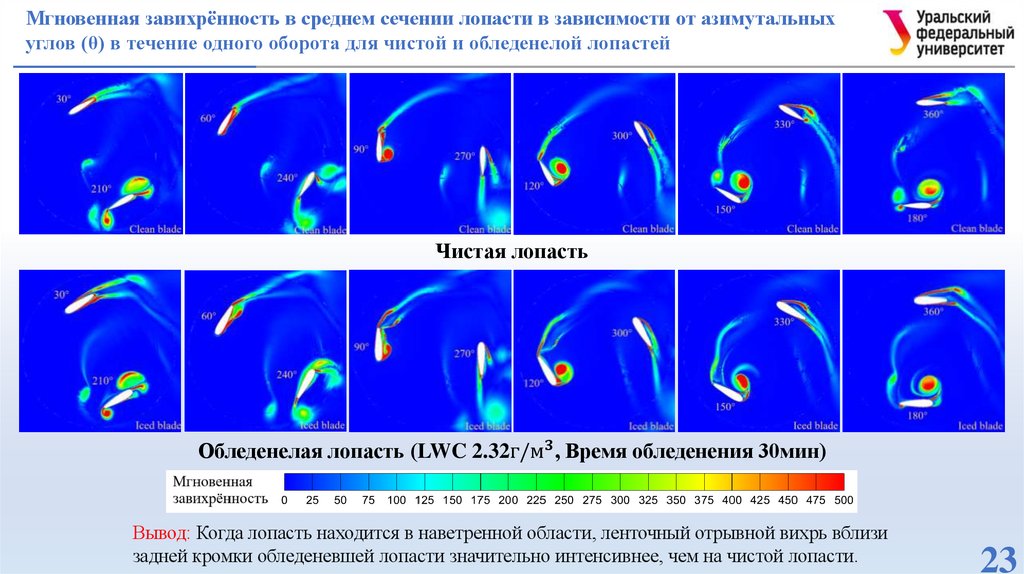 форму обледенения, коэффициент давления, контур мгновенной завихрённости.
