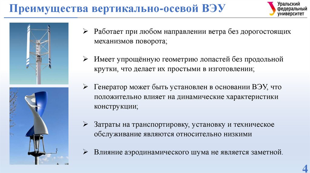 Преимущества вертикально-осевой ВЭУРаботает при любом направлении ветра без дорогостоящих