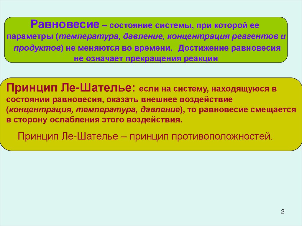Равновесие – состояние системы, при которой еепараметры (температура, давление, концентрация реагентов и
