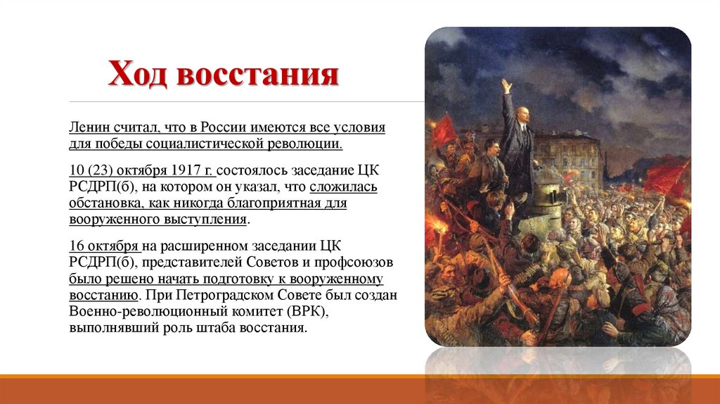 Ход восстанияЛенин считал, что в России имеются все условия