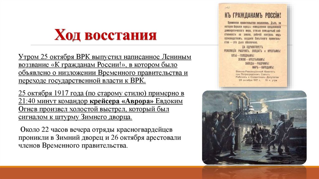 Ход восстанияУтром 25 октября ВРК выпустил написанное Лениным