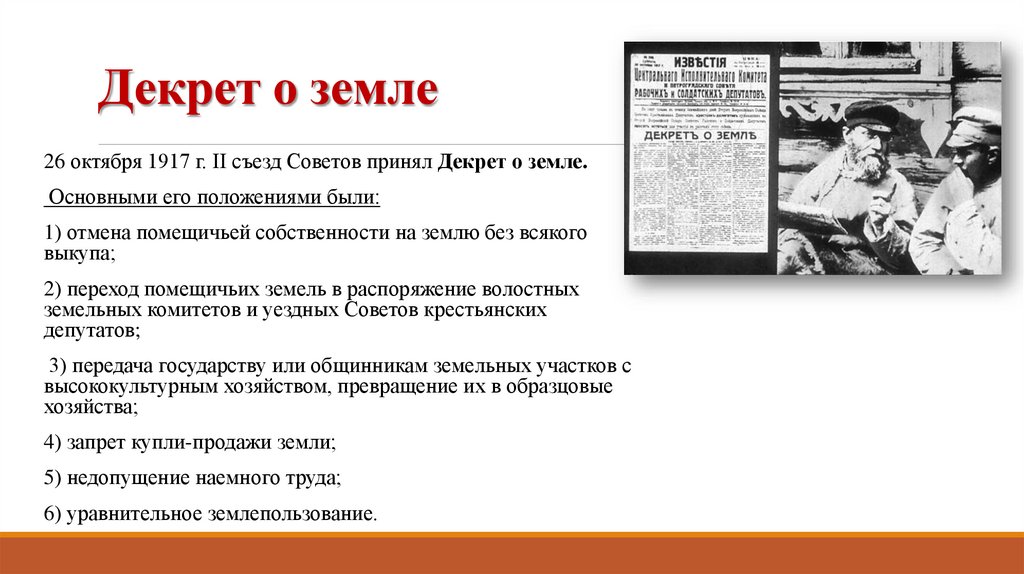 Декрет о земле26 октября 1917 г. II съезд Советов принял Декрет о земле.