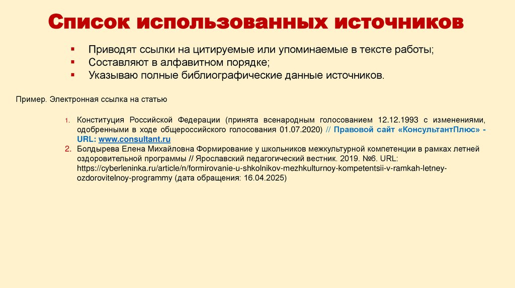 Список использованных источниковПриводят ссылки на цитируемые или упоминаемые в тексте работы;