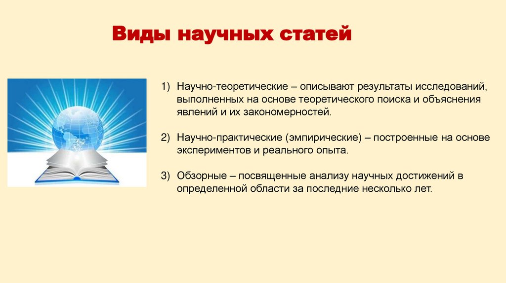 Виды научных статей1) Научно-теоретические – описывают результаты исследований,