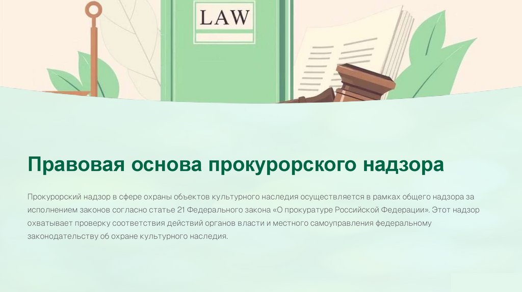 Правовая основа прокурорского надзораПрокурорский надзор в сфере охраны объектов культурного наследия осуществляется в рамках общего надзора за