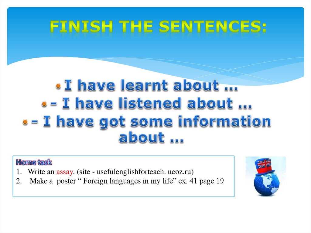 1. Write an assay. (site - usefulenglishforteach. ucoz.ru)2. Make a poster “ Foreign languages in my life” ex. 41 page 19