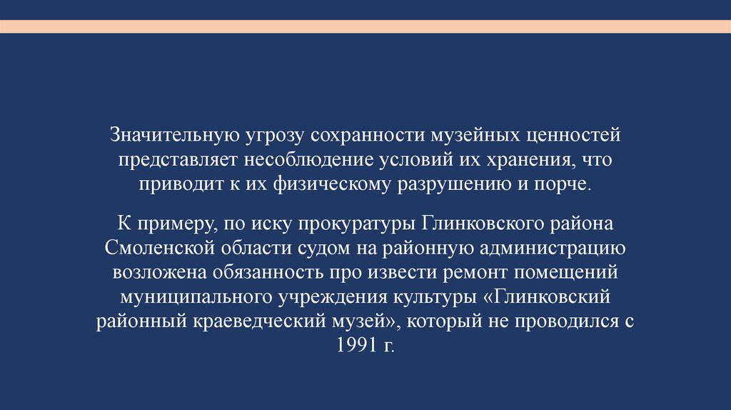 Значительную угрозу сохранности музейных ценностейпредставляет несоблюдение условий их хранения, что