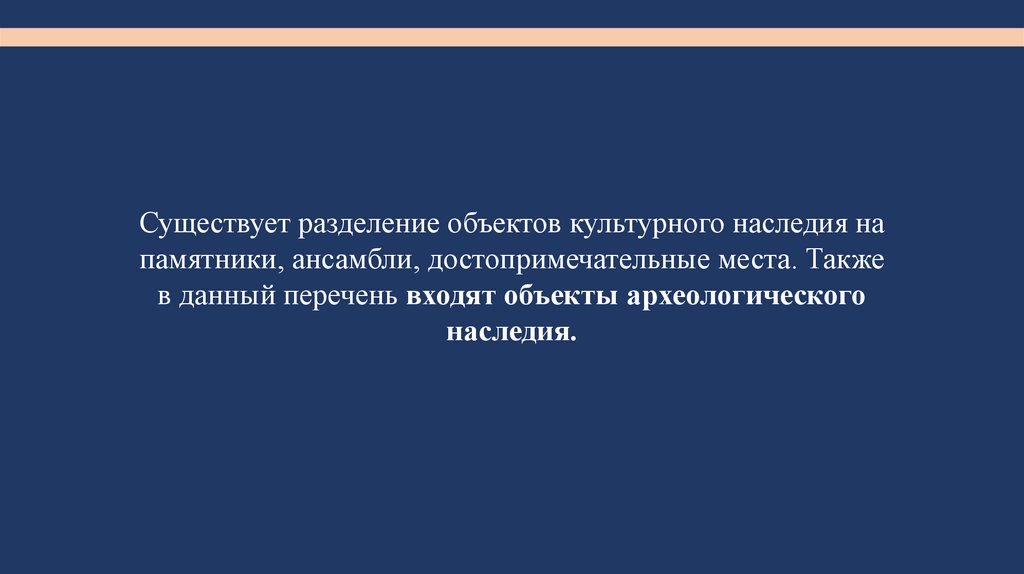 Существует разделение объектов культурного наследия напамятники, ансамбли, достопримечательные места. Также