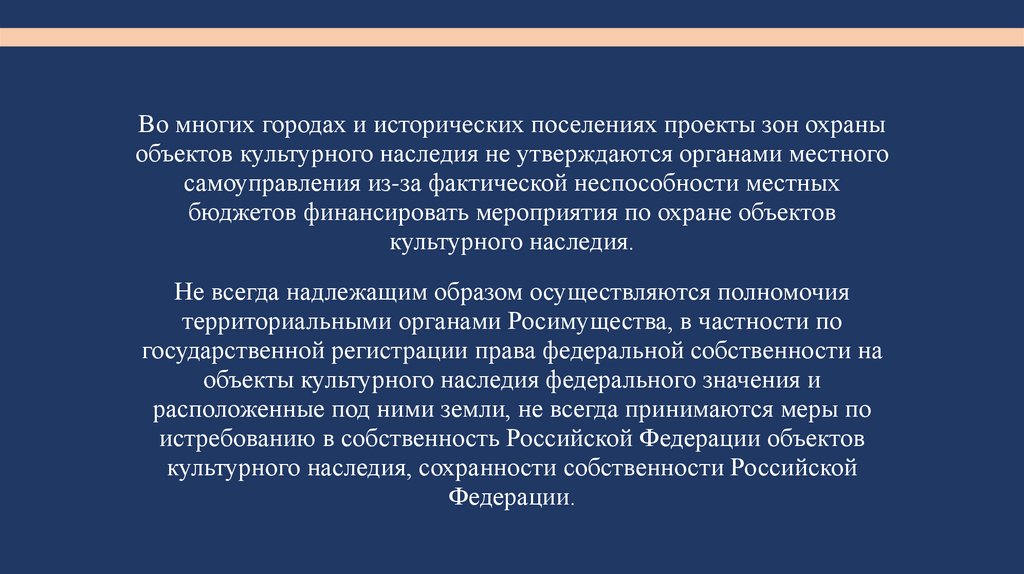 Во многих городах и исторических поселениях проекты зон охраныобъектов культурного наследия не утверждаются органами местного