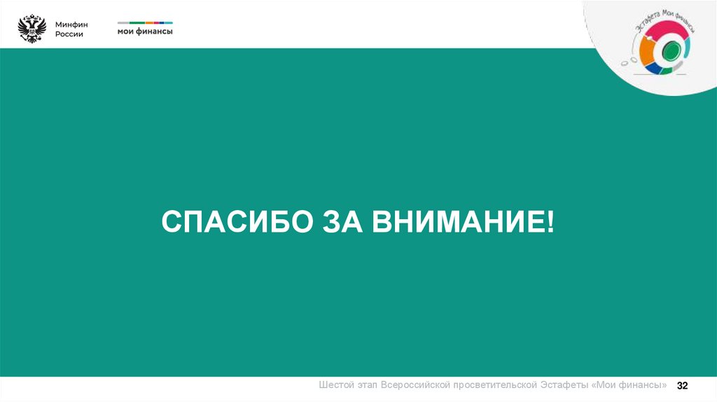 СПАСИБО ЗА ВНИМАНИЕ!Шестой этап Всероссийской просветительской Эстафеты «Мои финансы»