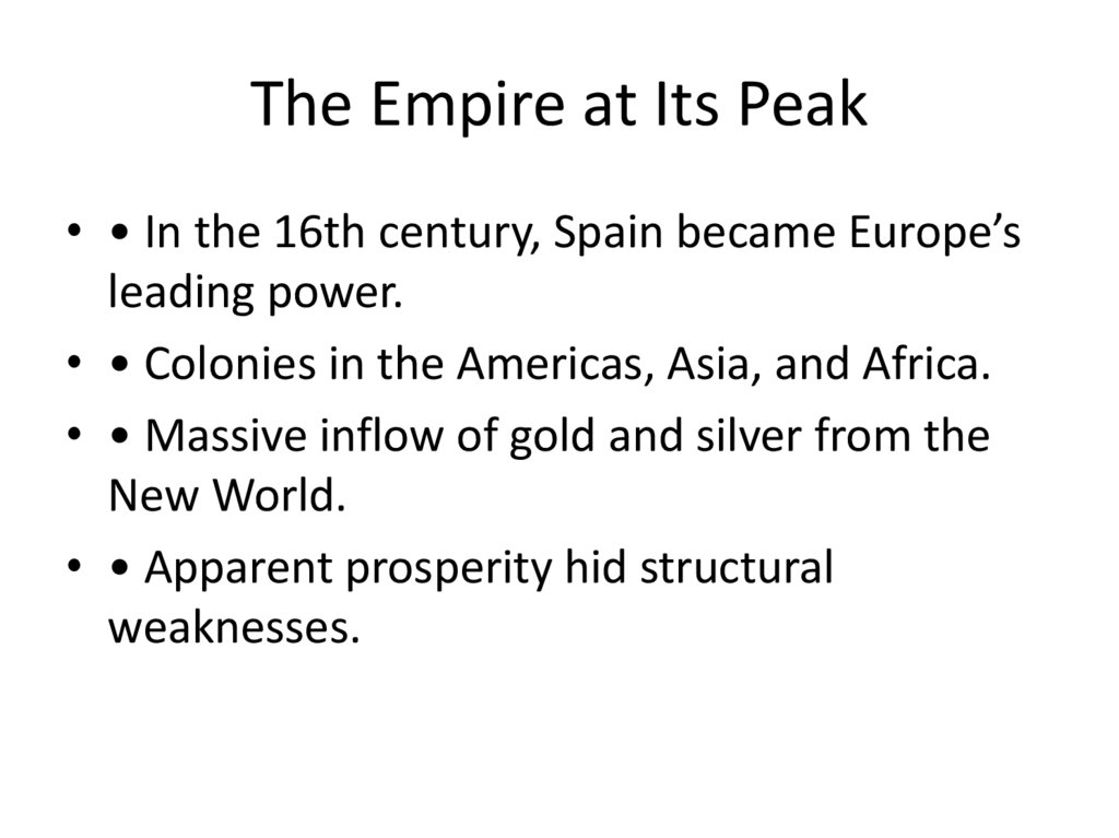 The Empire at Its Peak• • In the 16th century, Spain became Europe’s