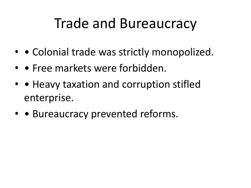 Trade and Bureaucracy• • Colonial trade was strictly monopolized.