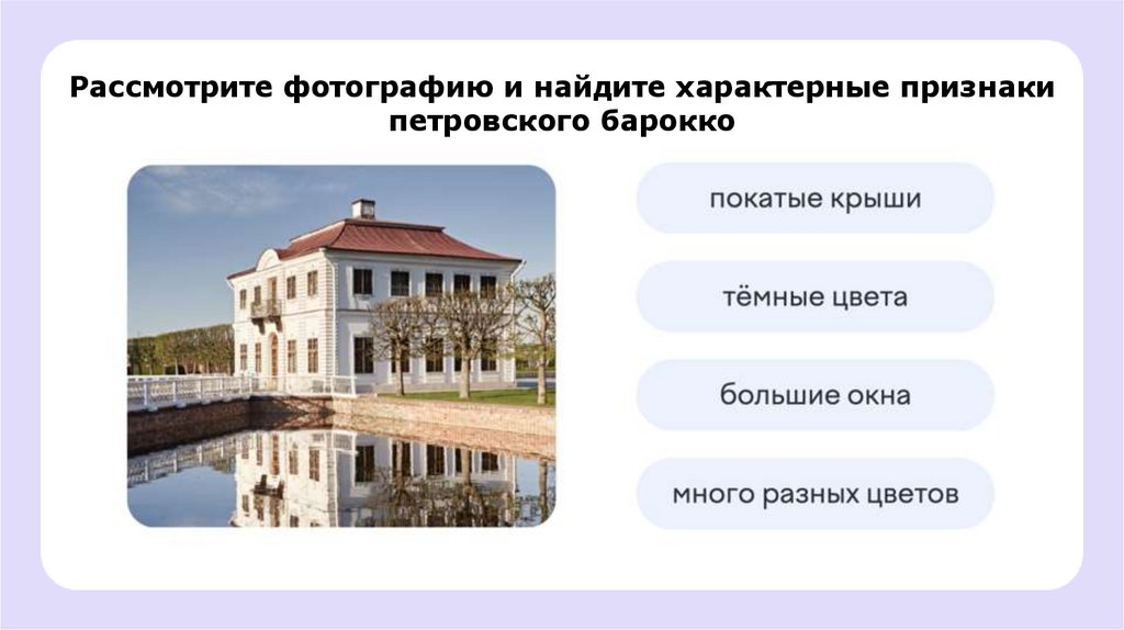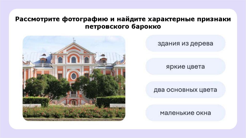 Рассмотрите фотографию и найдите характерные признакипетровского барокко