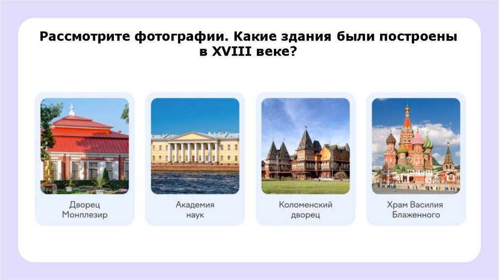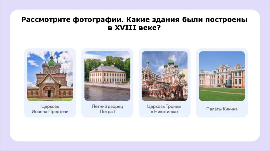 Рассмотрите фотографии. Какие здания были построеныв XVIII веке?