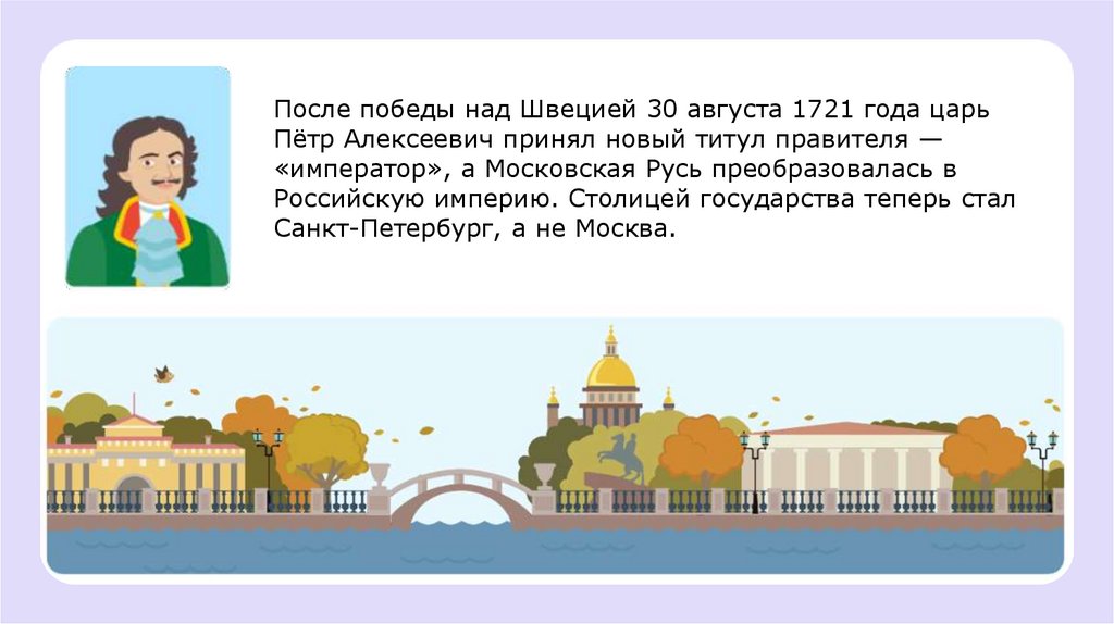 После победы над Швецией 30 августа 1721 года царьПётр Алексеевич принял новый титул правителя —