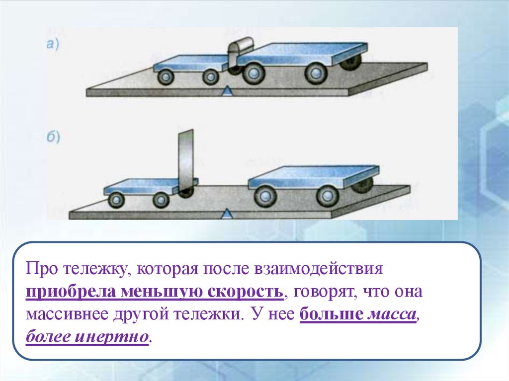 Про тележку, которая после взаимодействияприобрела меньшую скорость, говорят, что она