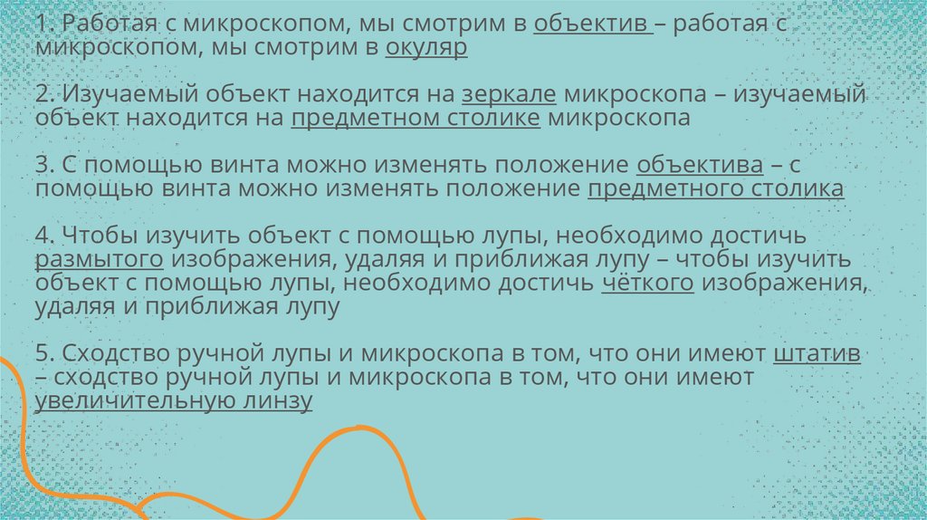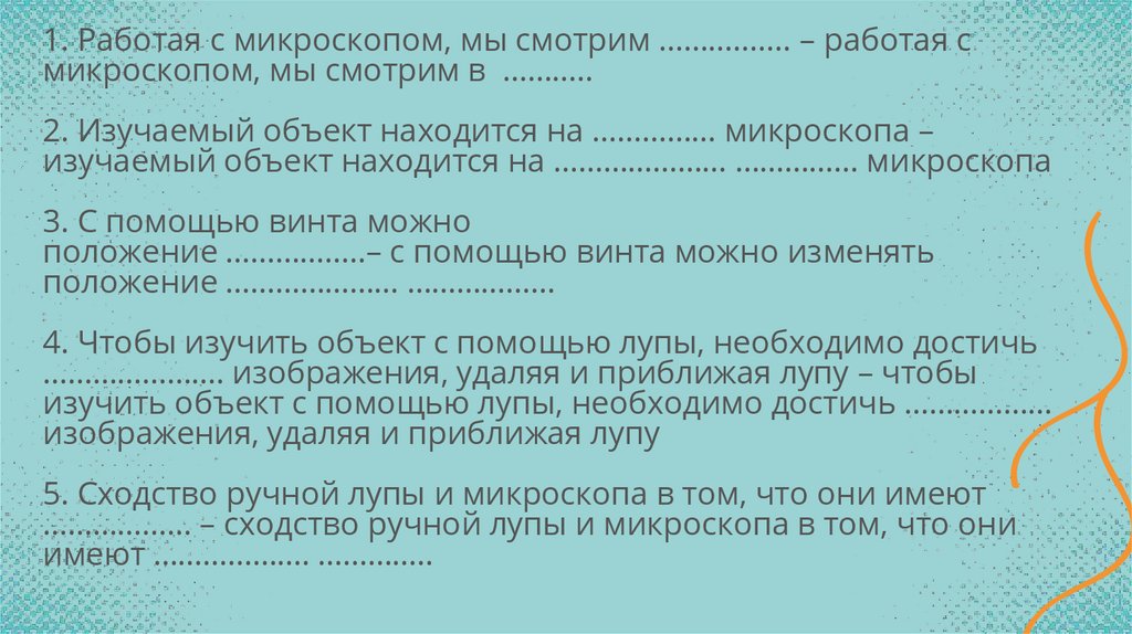 1. Работая с микроскопом, мы смотрим в объектив – работая смикроскопом, мы смотрим в окуляр
