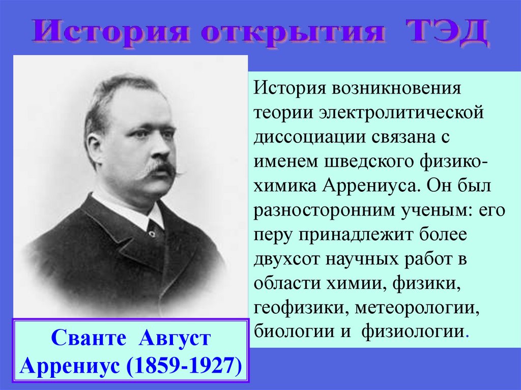 • ТЭД была предложена в 1887 году шведским ученымСванте Августом Аррениусом. Классическая теория