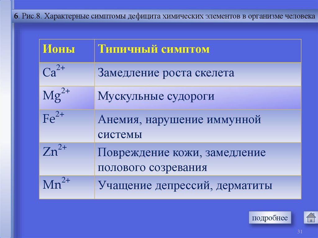 6. Рис.8. Характерные симптомы дефицита химических элементов в организме человекаИоны