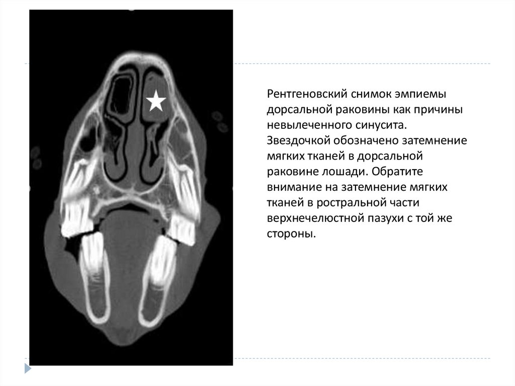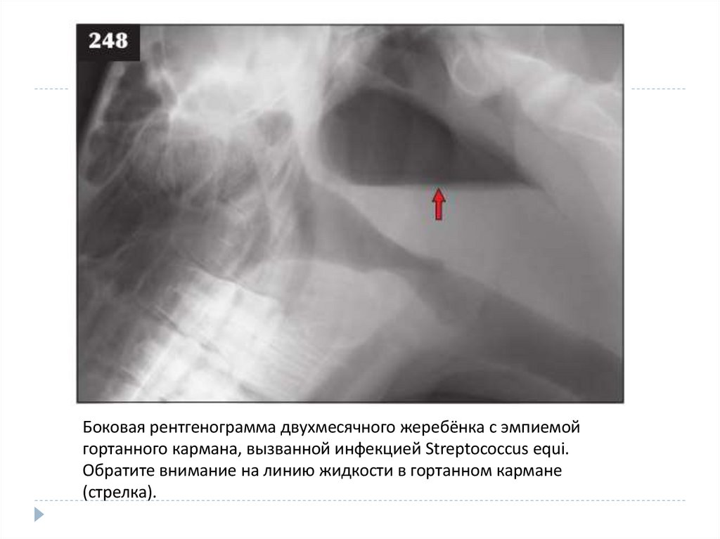 Боковая рентгенограмма двухмесячного жеребёнка с эмпиемойгортанного кармана, вызванной инфекцией Streptococcus equi.