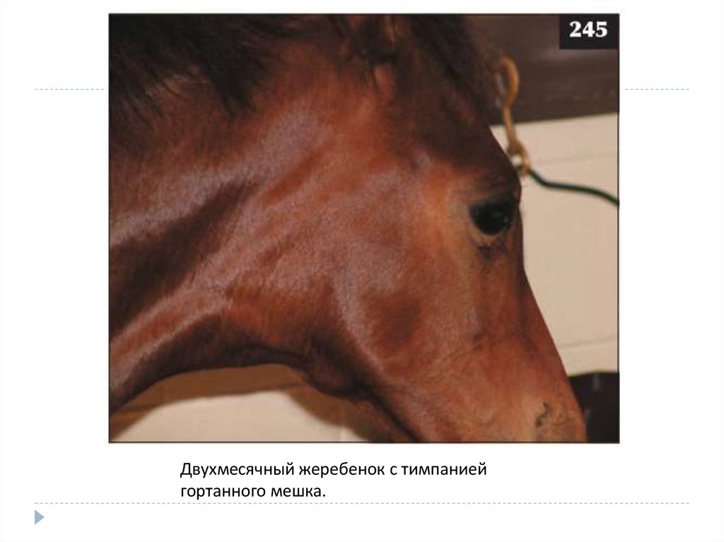 Тимпания — редкое заболевание жеребят, возникающее вследствиескопления воздуха водном или обоих гортанных мешках вследствие