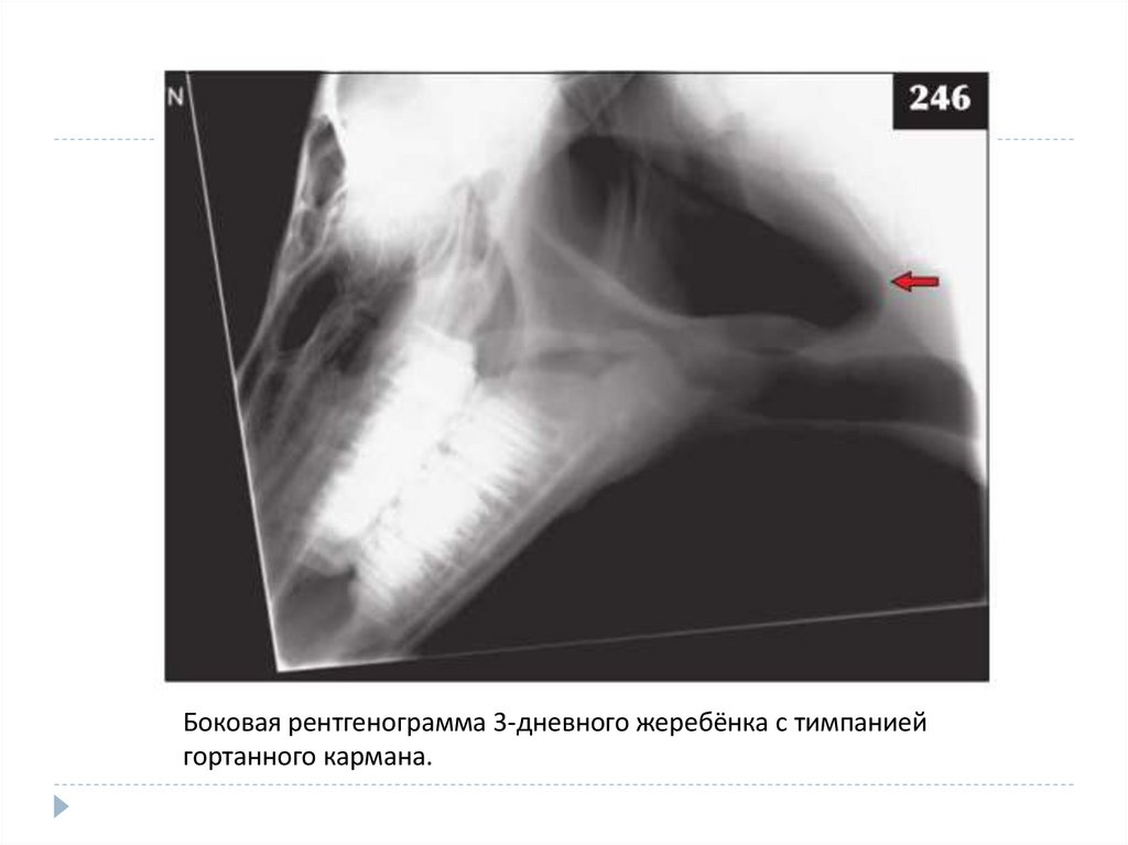 Боковая рентгенограмма 3-дневного жеребёнка с тимпаниейгортанного кармана.