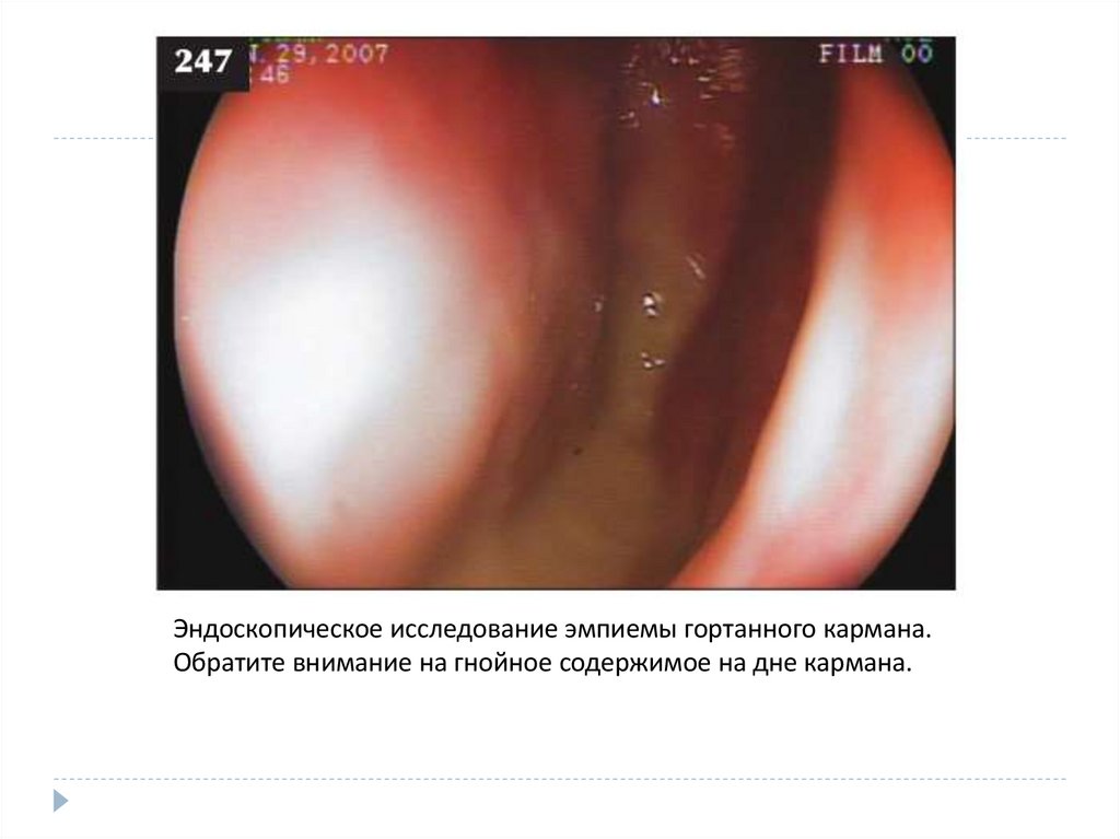 Эндоскопическое исследование эмпиемы гортанного кармана.Обратите внимание на гнойное содержимое на дне кармана.