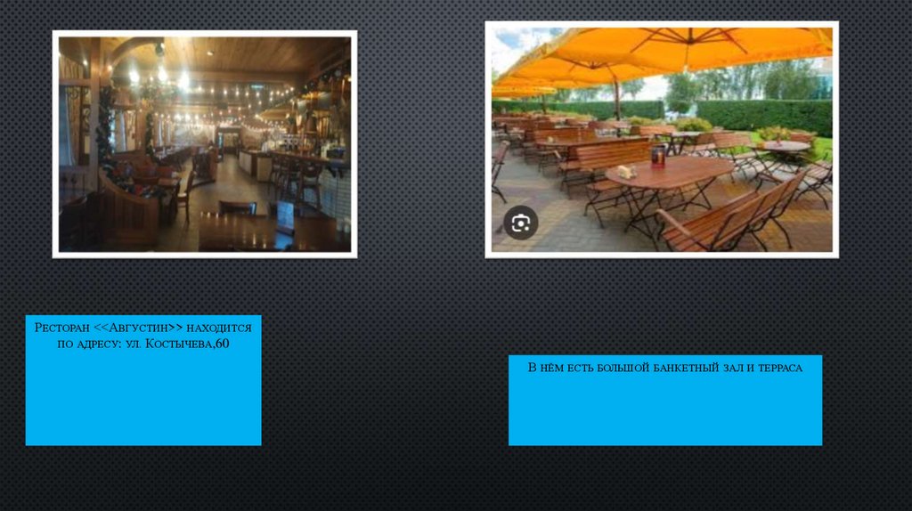 РЕСТОРАН <<АВГУСТИН>> НАХОДИТСЯПО АДРЕСУ: УЛ. КОСТЫЧЕВА,60