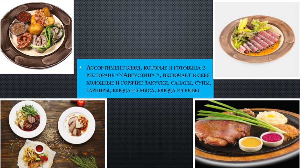 • АССОРТИМЕНТ БЛЮД, КОТОРЫЕ Я ГОТОВИЛА ВРЕСТОРАНЕ <<АВГУСТИН> >, ВКЛЮЧАЕТ В СЕБЯ