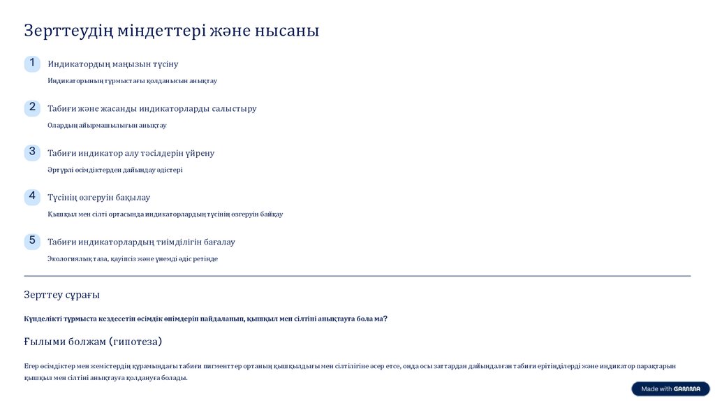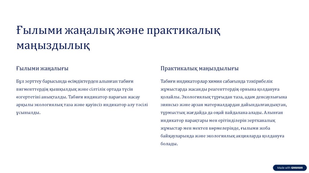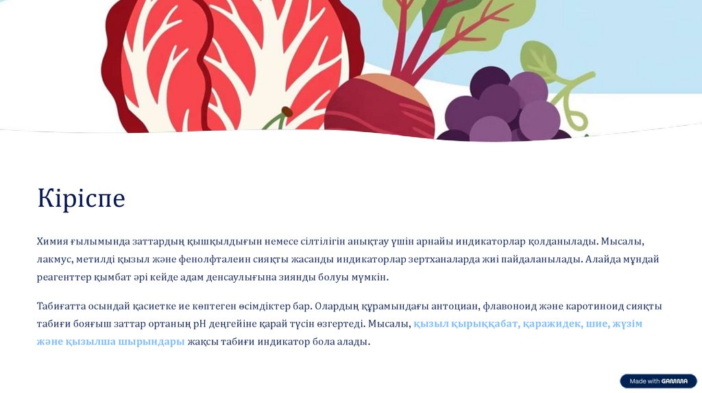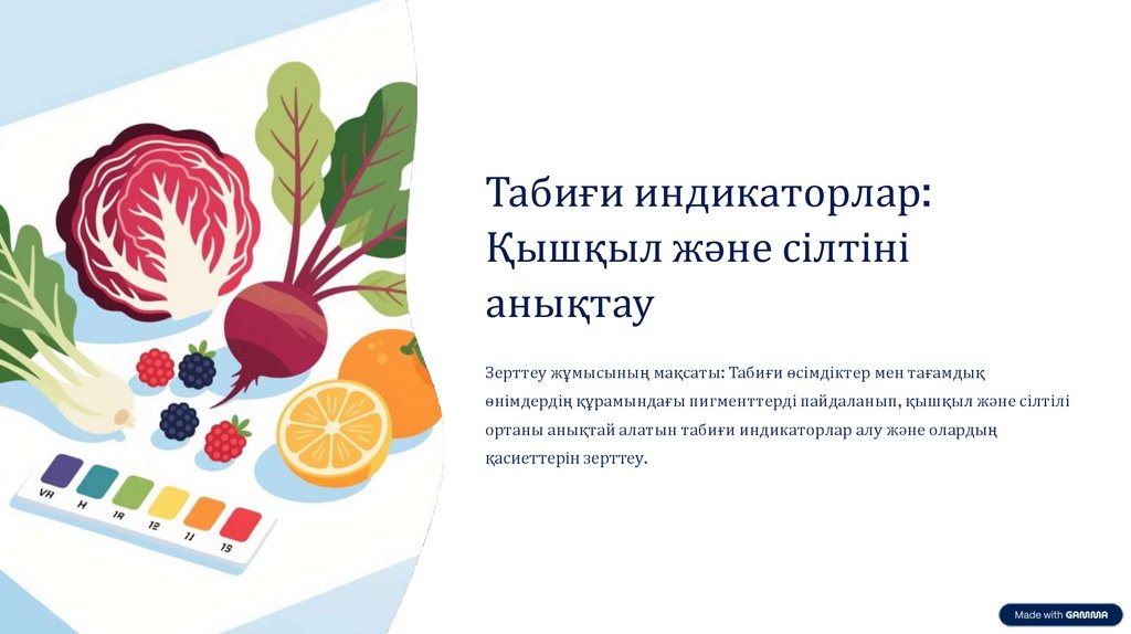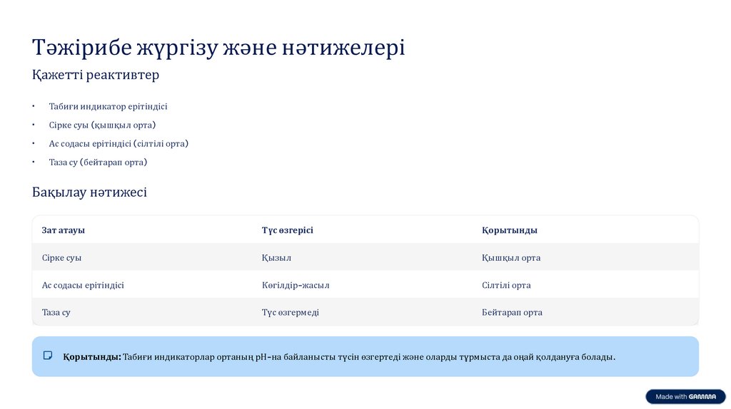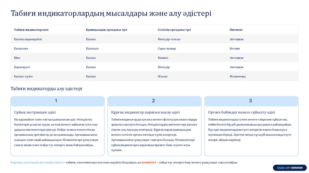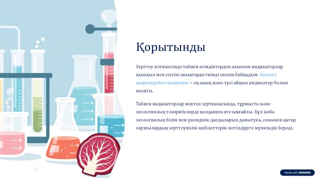 Қорытынды: Табиғи индикаторлар ортаның рН-на байланысты түсін өзгертеді және оларды тұрмыста да оңай қолдануға болады.