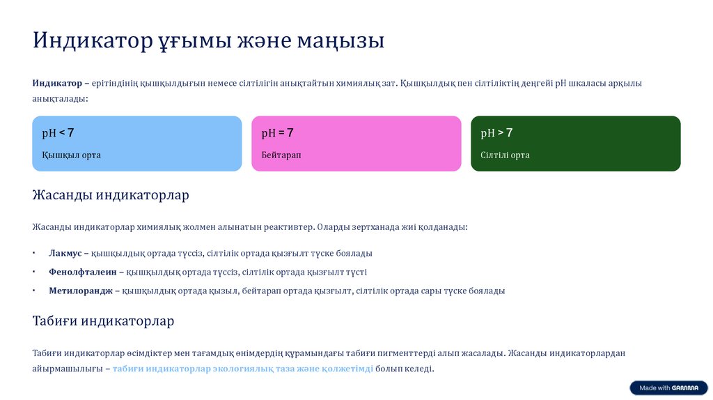 Индикатор ұғымы және маңызыИндикатор – ерітіндінің қышқылдығын немесе сілтілігін анықтайтын химиялық зат. Қышқылдық пен сілтіліктің деңгейі рН шкаласы арқылы