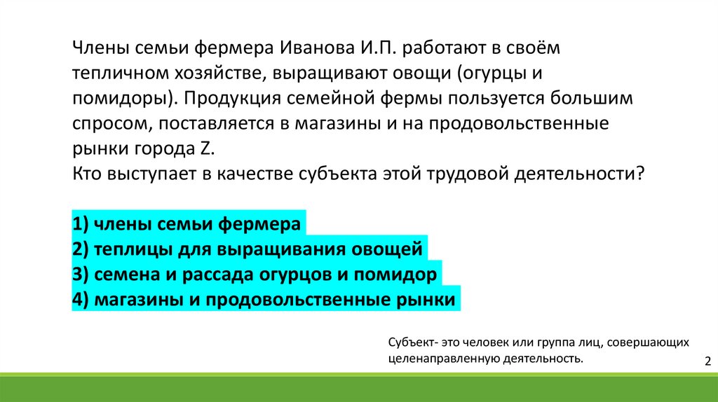 Члены семьи фермера Иванова И.П. работают в своёмтепличном хозяйстве, выращивают овощи (огурцы и