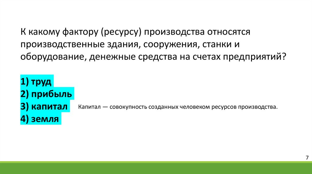 3) капитал Капитал — совокупность созданных человеком ресурсов производства.